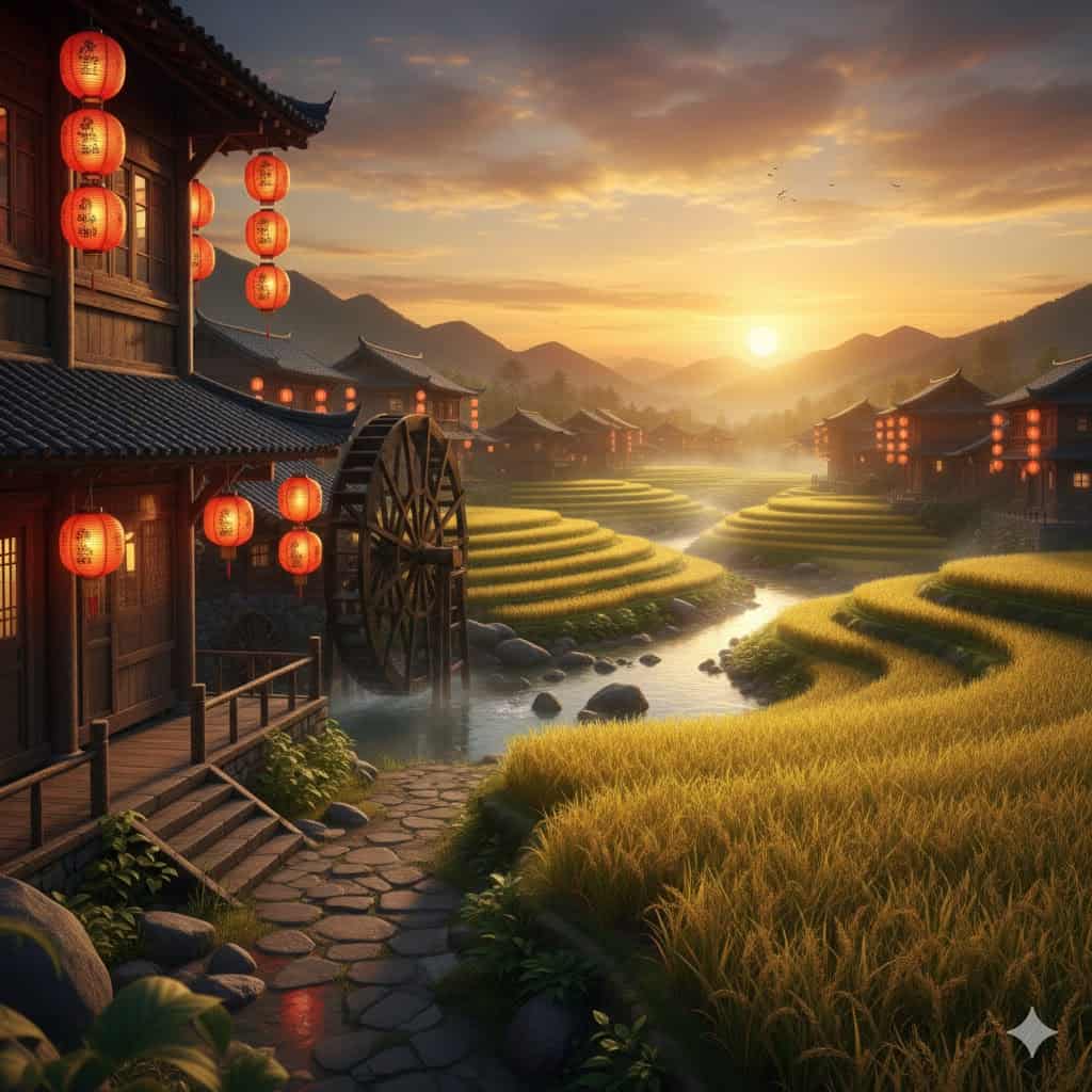Latar permainan menampilkan area pedesaan dengan rumah kayu tradisional, ladang padi yang bergerak mengikuti angin, serta lentera merah yang berayun lembut. Langit keemasan menambah nuansa damai, memberikan identitas visual yang hangat dan menyenangkan.